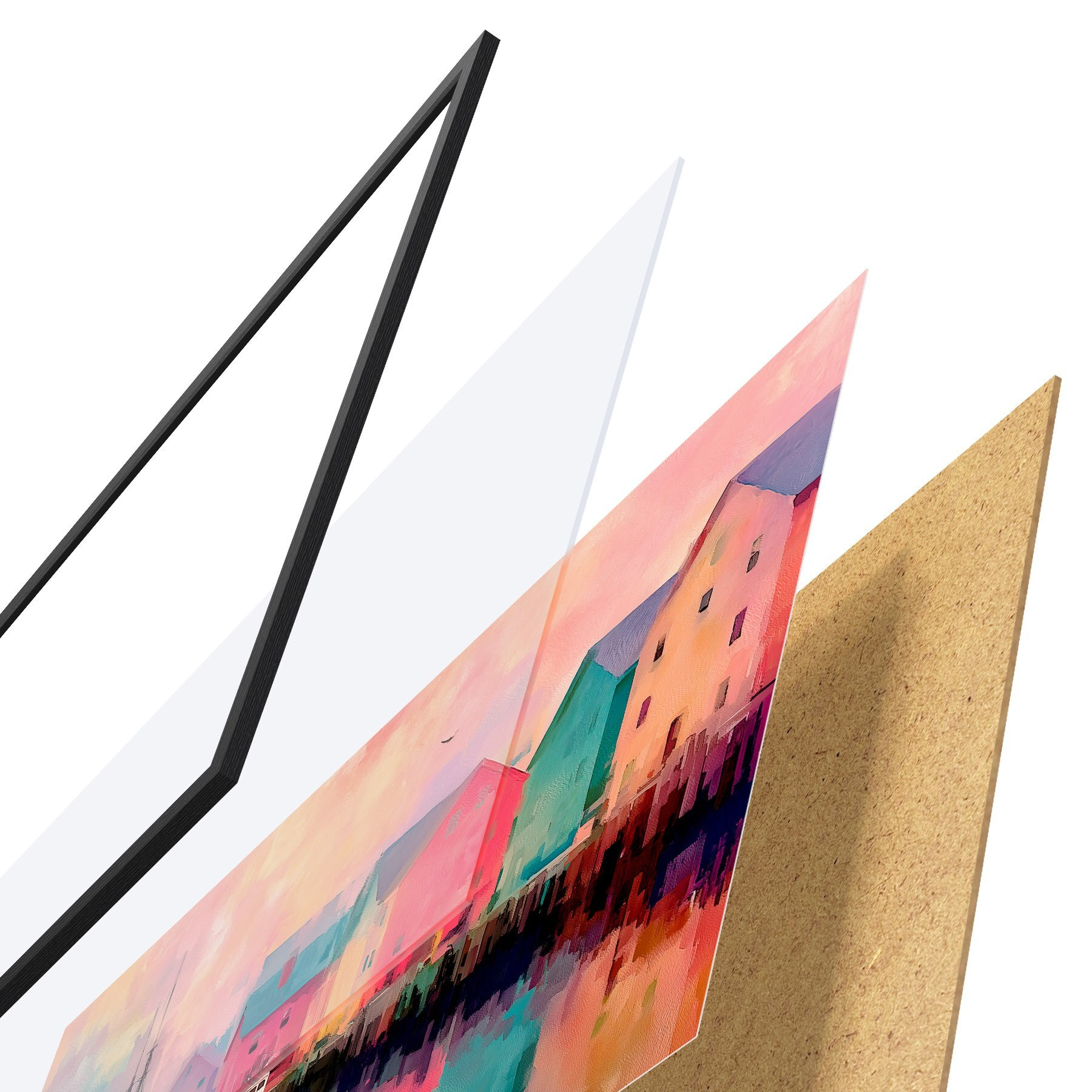Il poster è composto da cornice, plexiglass, immagine stampata e supporto in truciolato. Il poster può essere immediatamente appeso alla parete grazie ai supporti sul retro.