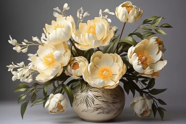 Poster Fiori delicati con centro giallo in un vaso a fantasia Nr f44847