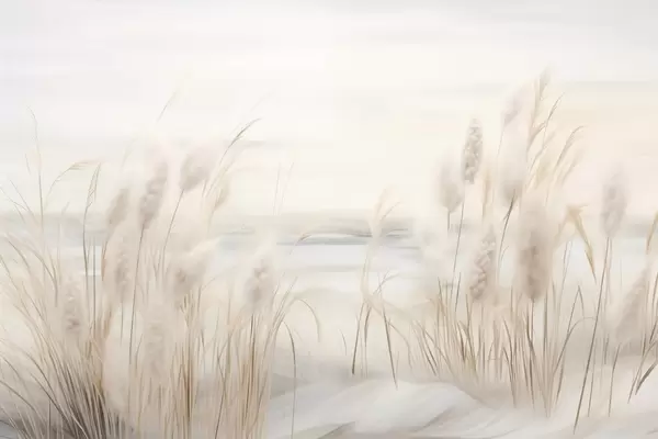 Poster Canne beige in primo piano, con teste di semi, morbide e delicate, uno sfondo sfocato e un cielo chiaro Nr f44851