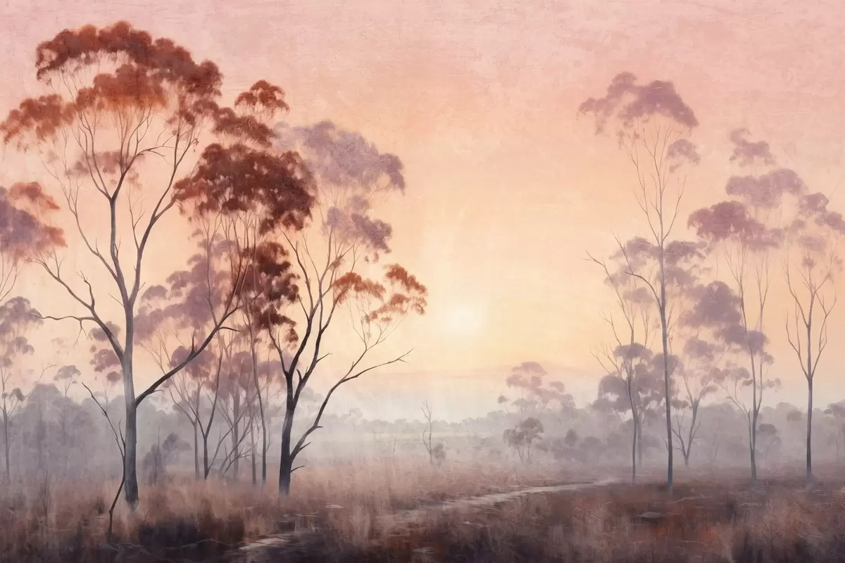 Poster Un dipinto di paesaggio di un campo con erba alta e alberi, il sole sullo sfondo Nr f44854