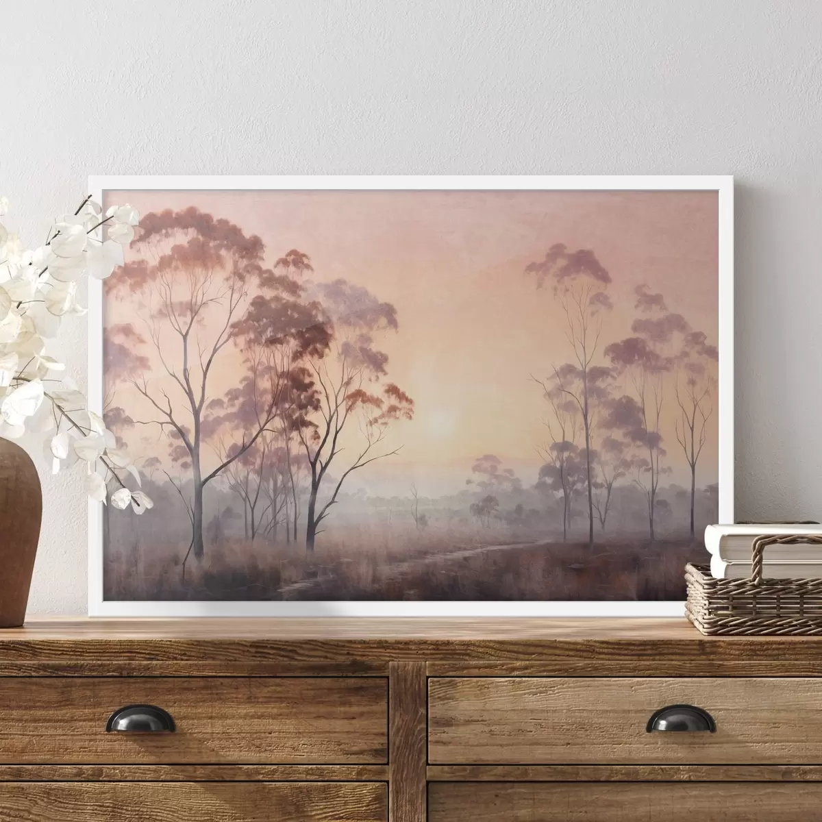 Poster Un dipinto di paesaggio di un campo con erba alta e alberi, il sole sullo sfondo f44854