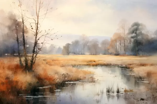 Poster Una tranquilla pittura paesaggistica con texture ad imitazione di canne e alberi spogli, l'acqua calma sotto un cielo Nr f44867