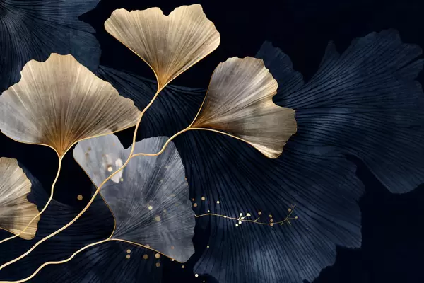 Poster Foglie di ginkgo nei toni del giallo e del blu, elegante sfondo scuro, arte moderna, stile minimalista, ispirato alla natura Nr f44921