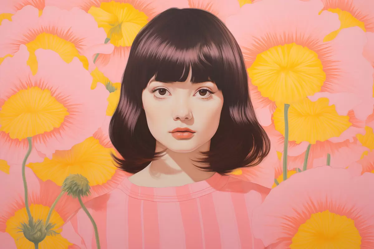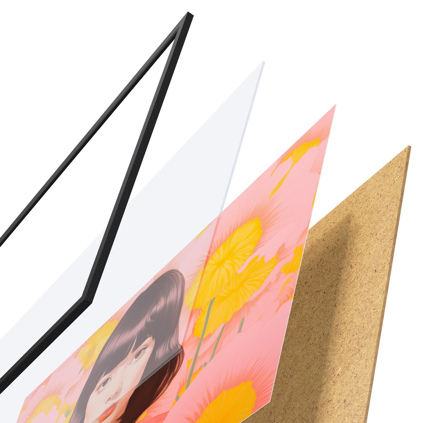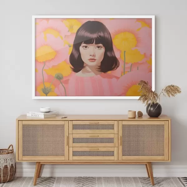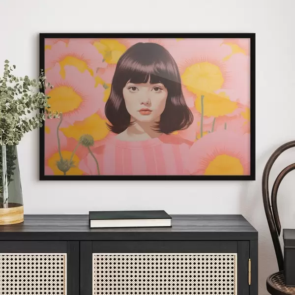Poster Un ritratto decorativo minimalista di ragazza asiatica in un campo di fiori gialli e rosa Nr f44924
