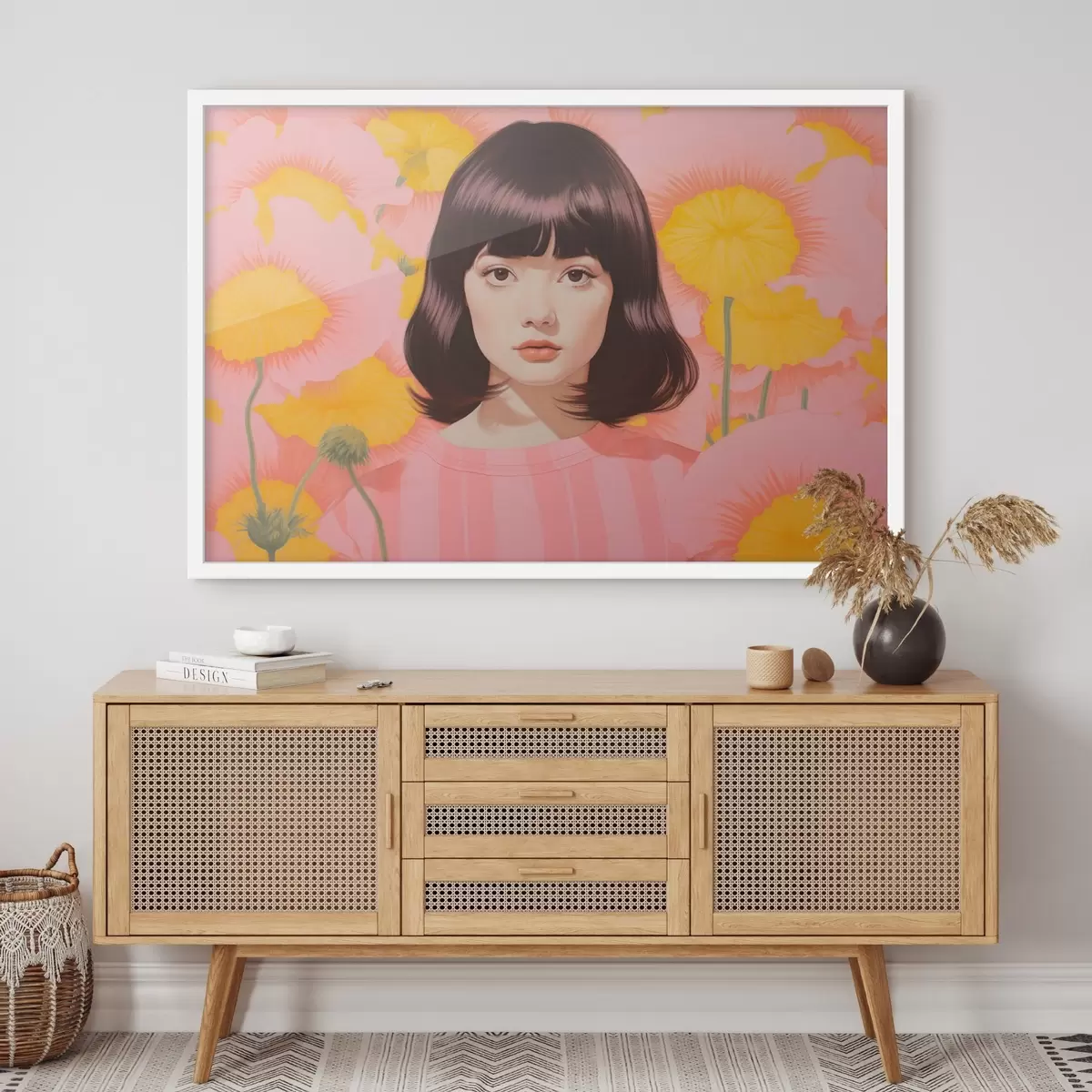 Poster Un ritratto decorativo minimalista di ragazza asiatica in un campo di fiori gialli e rosa f44924