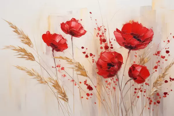 Poster Fiori di papavero rossi con steli di grano gialli, su uno sfondo morbido e neutro con schizzi di vernice rossa Nr f44926
