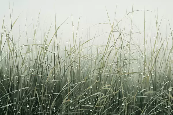 Poster Erba con gocce d'acqua, sfumature verdi, luce soffusa, sfondo nebbioso, stile astratto minimalista con texture Nr f44932
