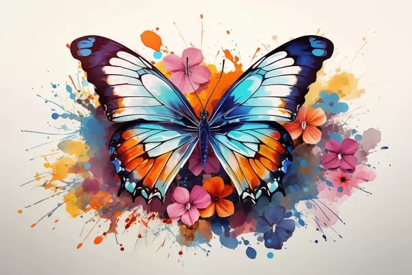 Poster Composizione dinamica di una farfalla e macchie floreali in stile artistico f44943