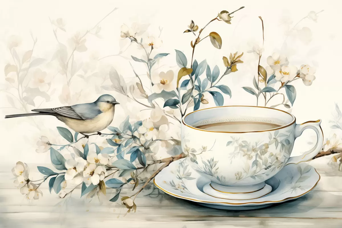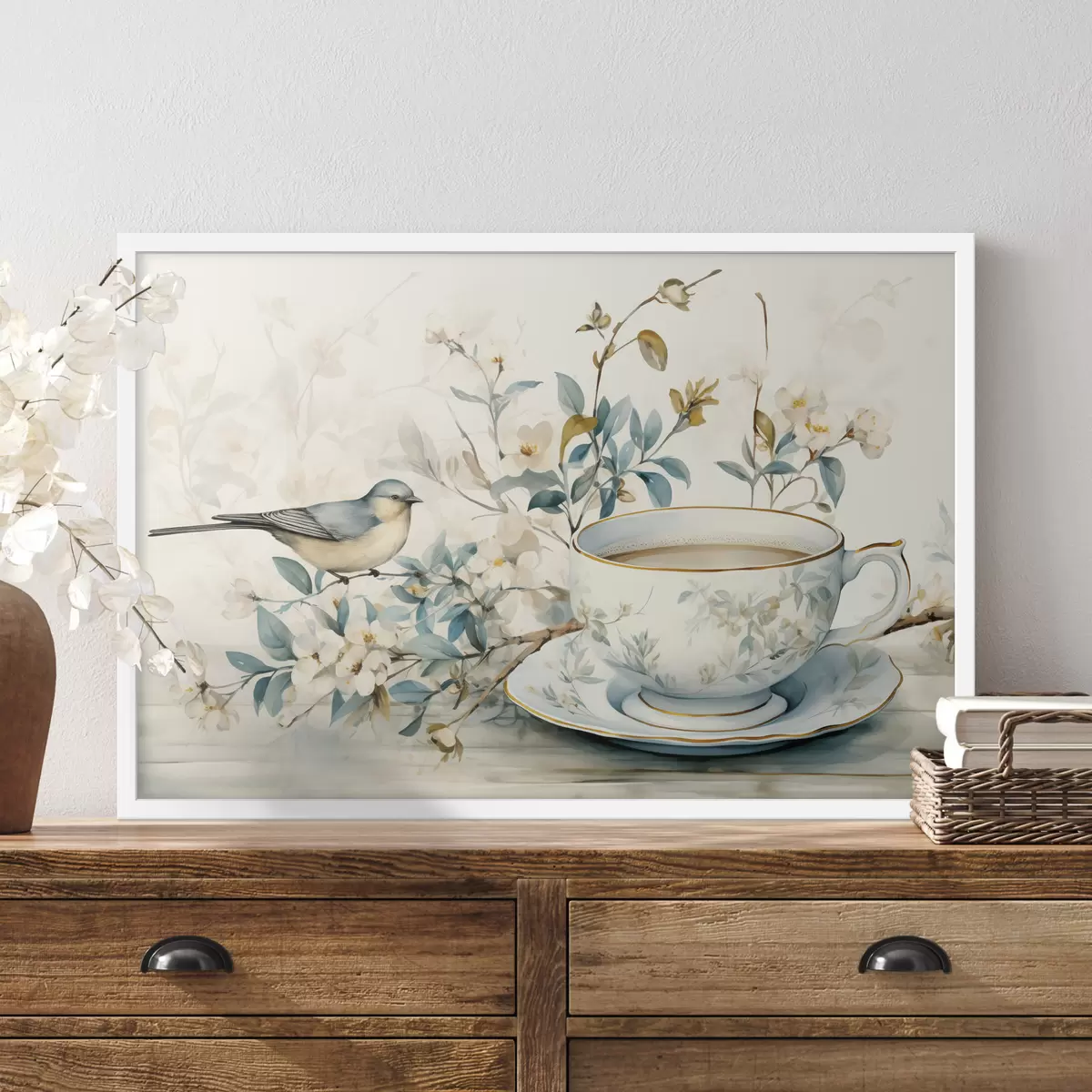Poster Uccello su un ramo con fiori vicino a una tazza in tonalità pastello Nr f45047