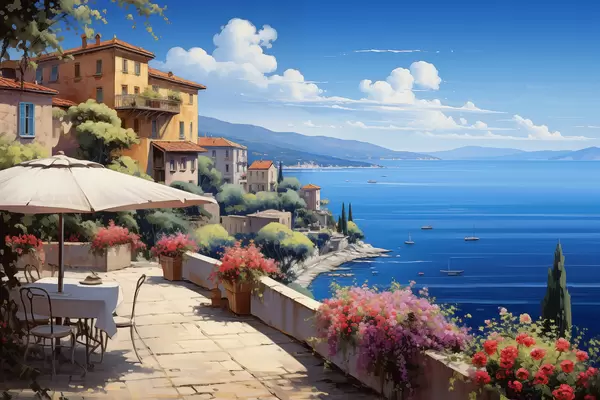 Poster Paesaggio mediterraneo con terrazza fiorita in stile artistico Nr f45053