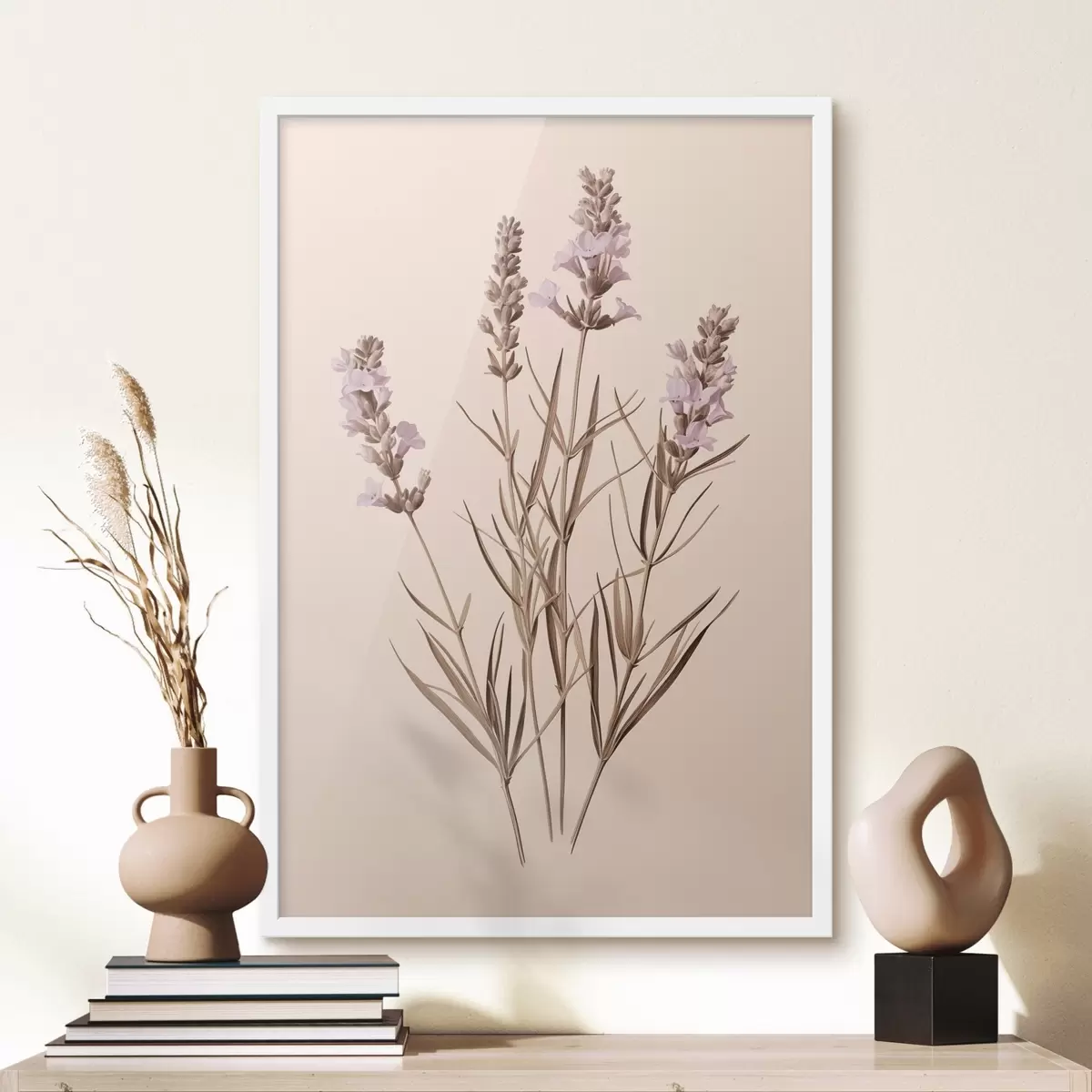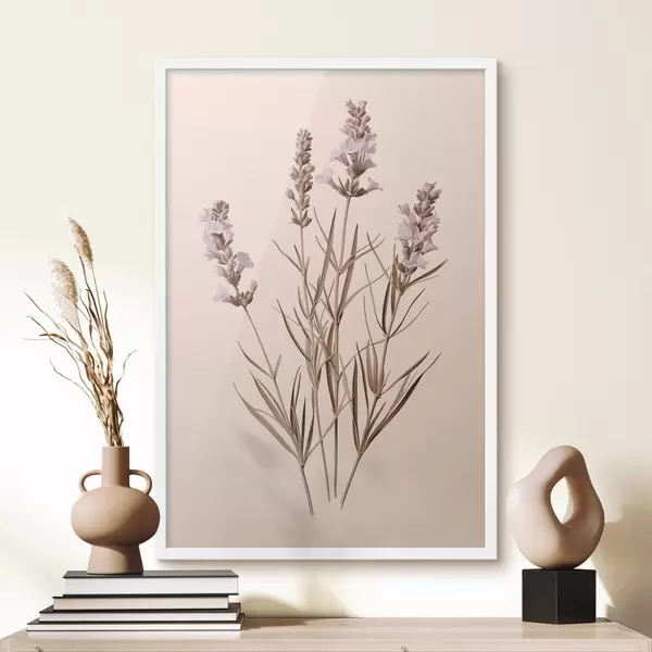 Poster lavanda, botanica, sfondo beige, viola tenue, foglie, floreale, naturale, stelo Nr f45100