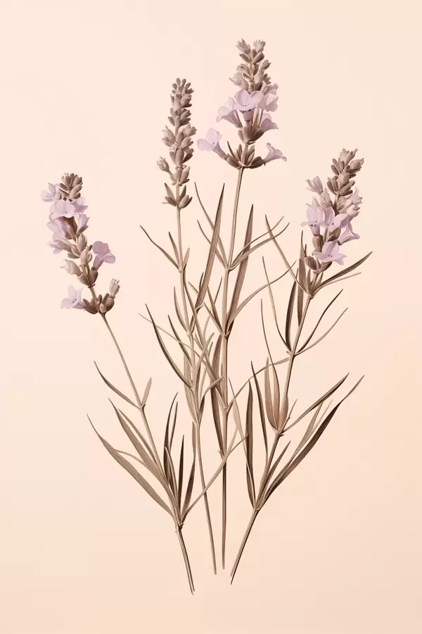 Poster lavanda, botanica, sfondo beige, viola tenue, foglie, floreale, naturale, stelo Nr f45100
