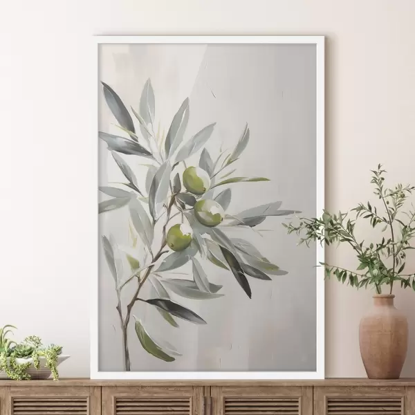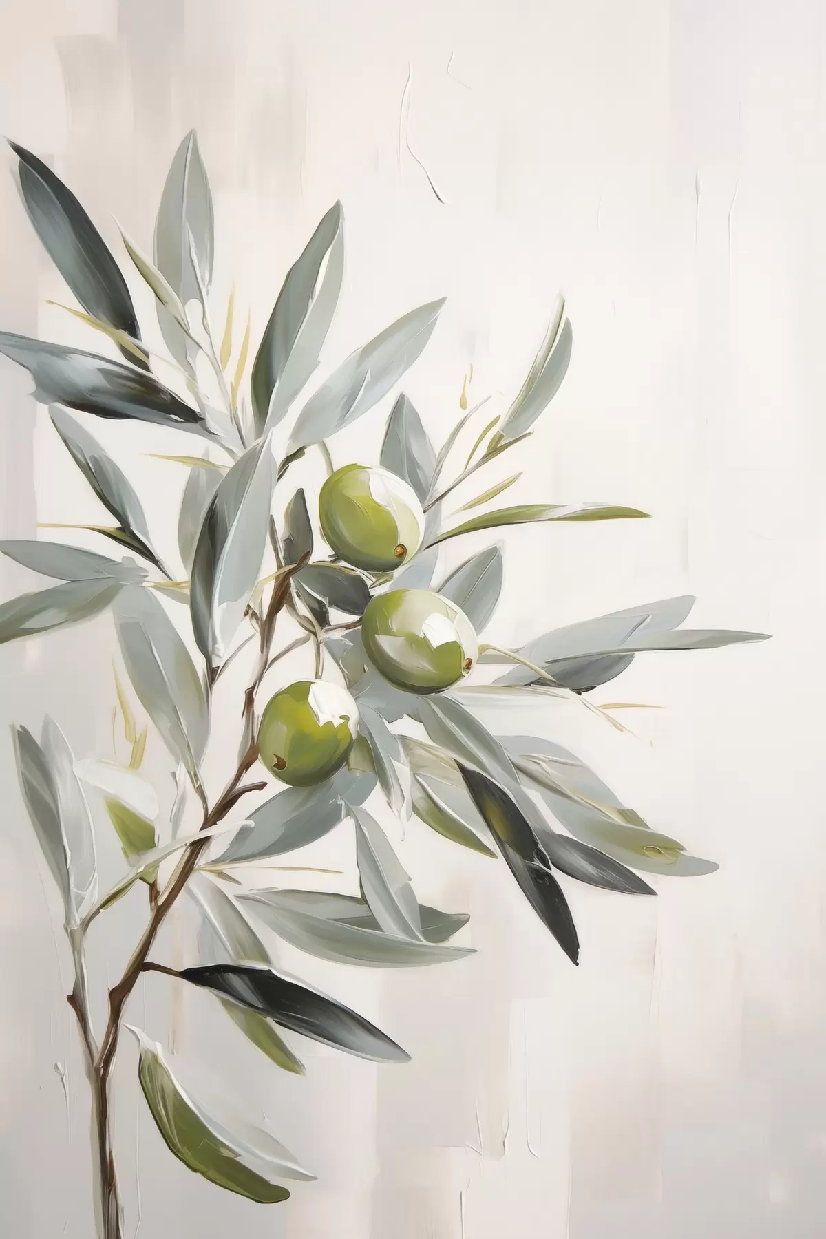 Poster ramo d'ulivo, frutto verde, toni tenui, foglie, minimal, naturale, pittura a olio, botanica Nr f45109