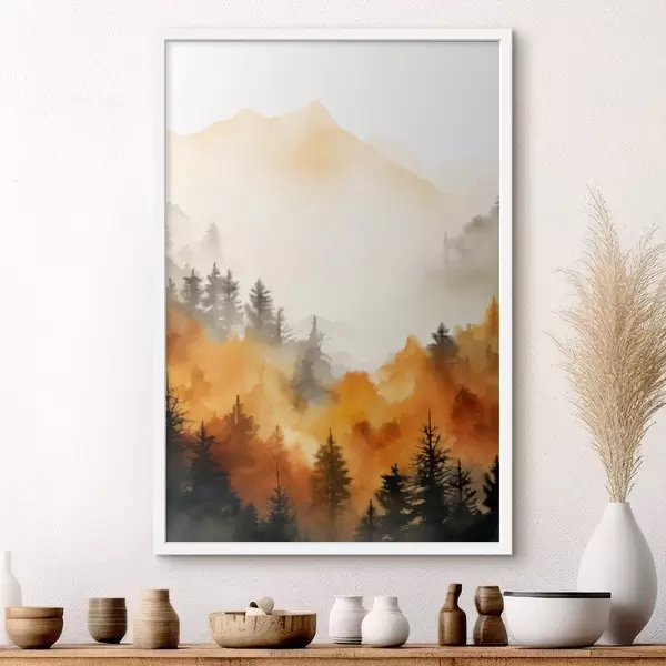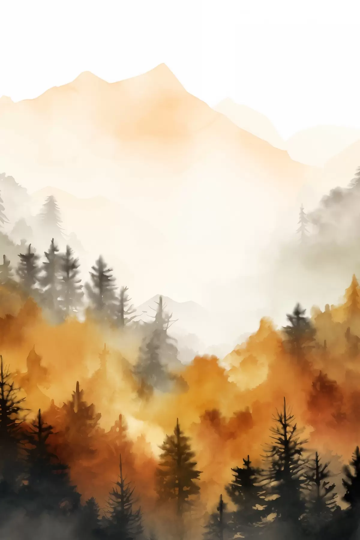 Poster Un paesaggio dipinto ad acquerello imitazione di una foresta con alti pini e montagne sullo sfondo f45169