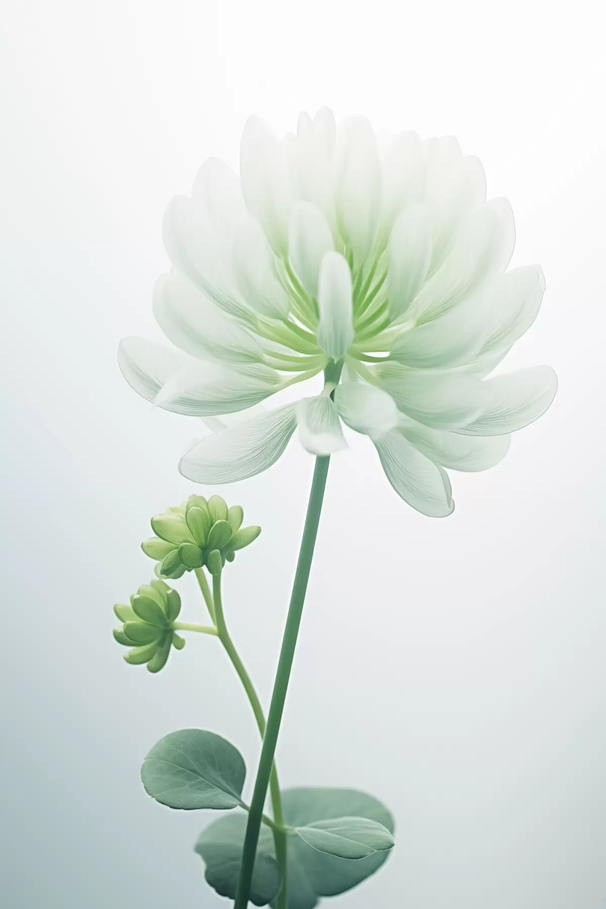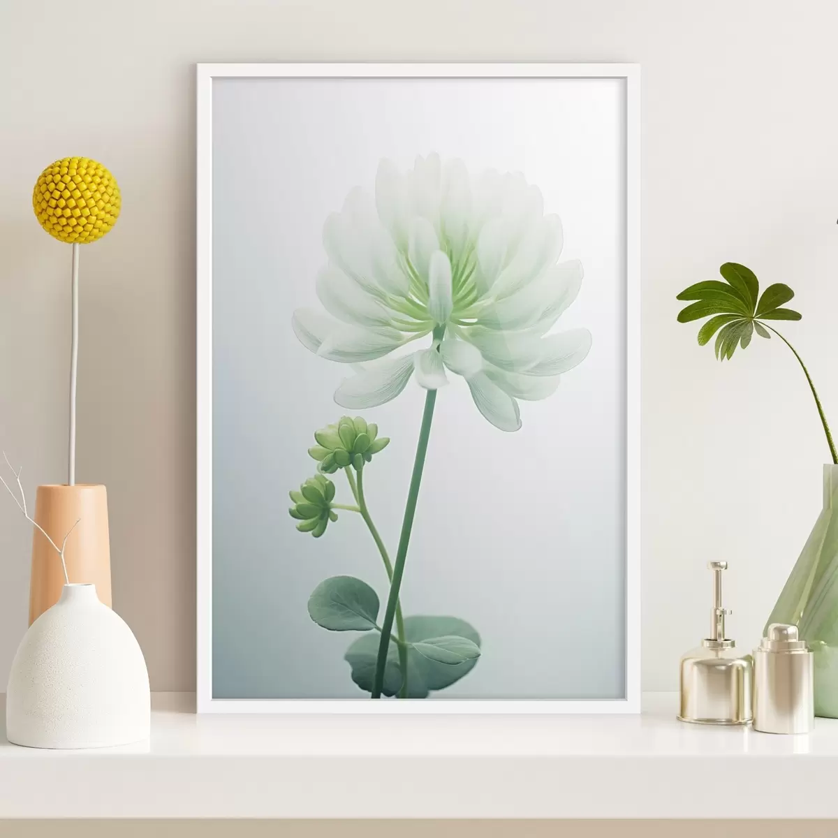 Poster Fiore di trifoglio bianco con stelo e foglie verdi, illuminazione soffusa, sfondo pulito, composizione minimalista, botanica Nr f45171