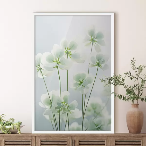 Poster Fiori di trifoglio bianco con stelo e foglie verdi, luce soffusa, sfondo pulito, composizione minimalista, botanica Nr f45172