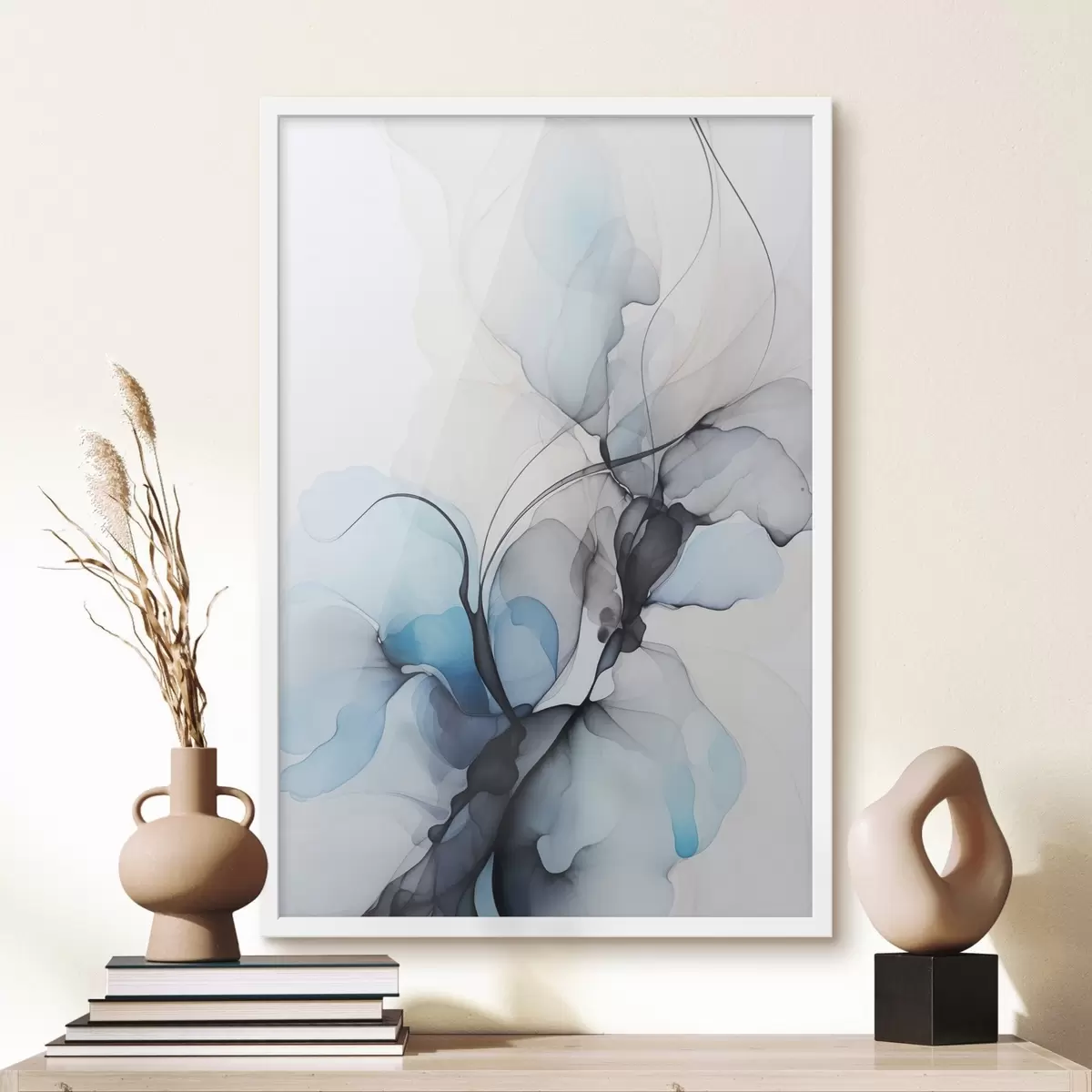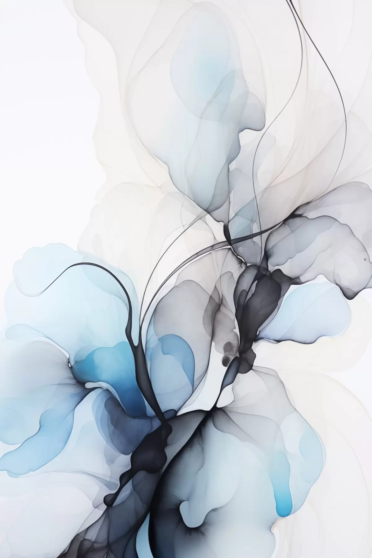 Poster Composizione astratta con linee fluide e petali traslucidi nei toni del blu, del bianco e del beige, imitazione di inchiostro ad alcool Nr f45177