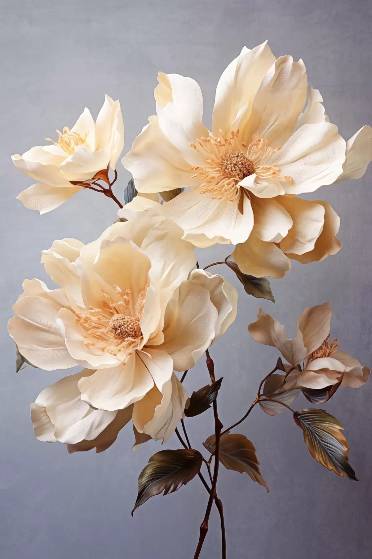Poster Fiori strutturati con pistilli arancioni e foglie arancioni su sfondo grigio, luce morbida, elegante, dettagliato, realistico f45182