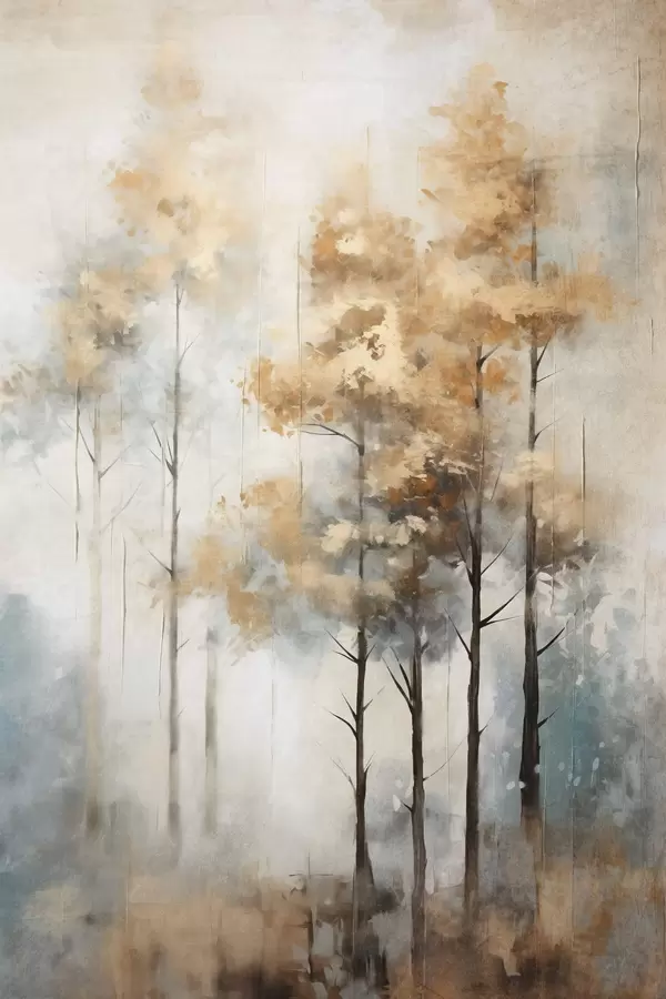 Poster Alberi alti e strutturati con foglie gialle in una foresta, lo sfondo è un mix di toni morbidi blu e marroni Nr f45187