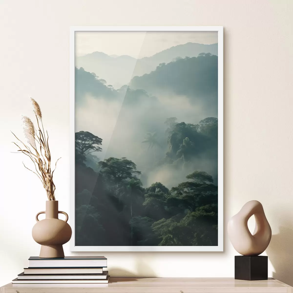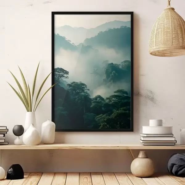 Poster Foresta pluviale tropicale con alberi verdi e uno spesso strato di nebbia che crea un ambiente suggestivo Nr f45189