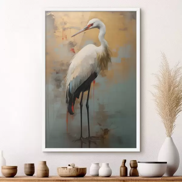 Poster Airone bianco su uno sfondo di sfumature gialle, marroni e blu che suggeriscono un paesaggio nebbioso e astratto Nr f45191