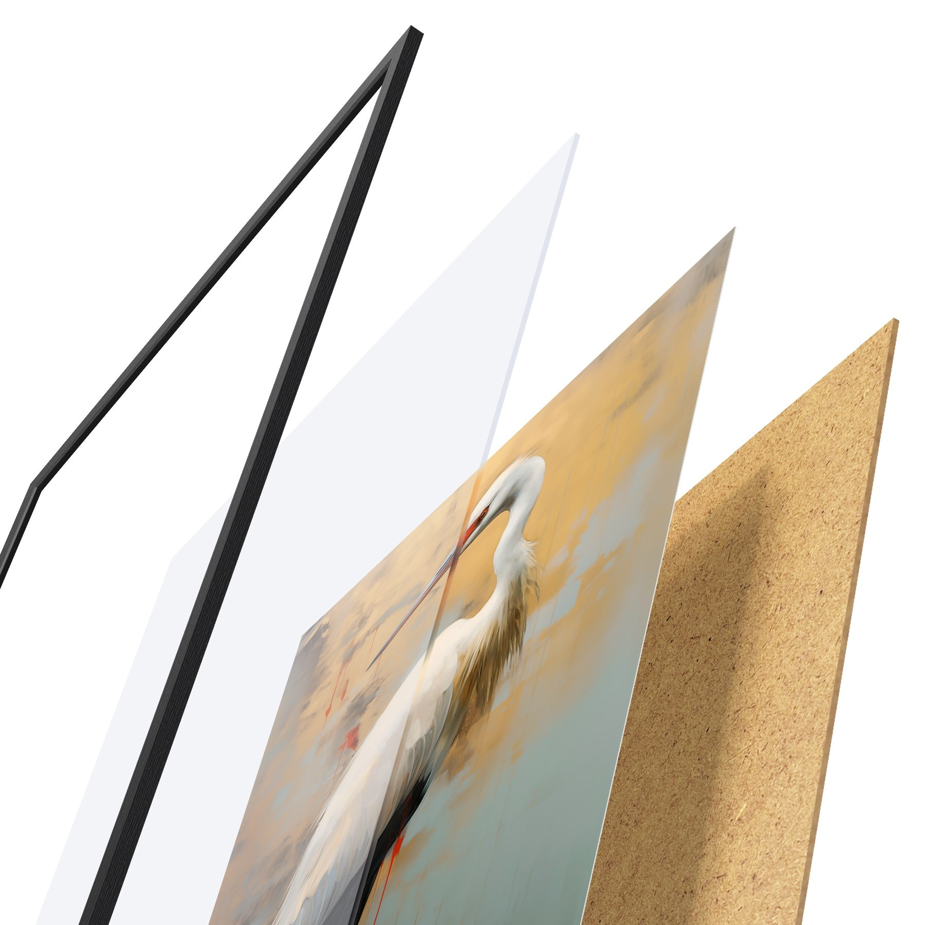Poster Airone bianco su uno sfondo di sfumature gialle, marroni e blu che suggeriscono un paesaggio nebbioso e astratto f45191