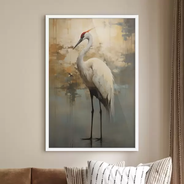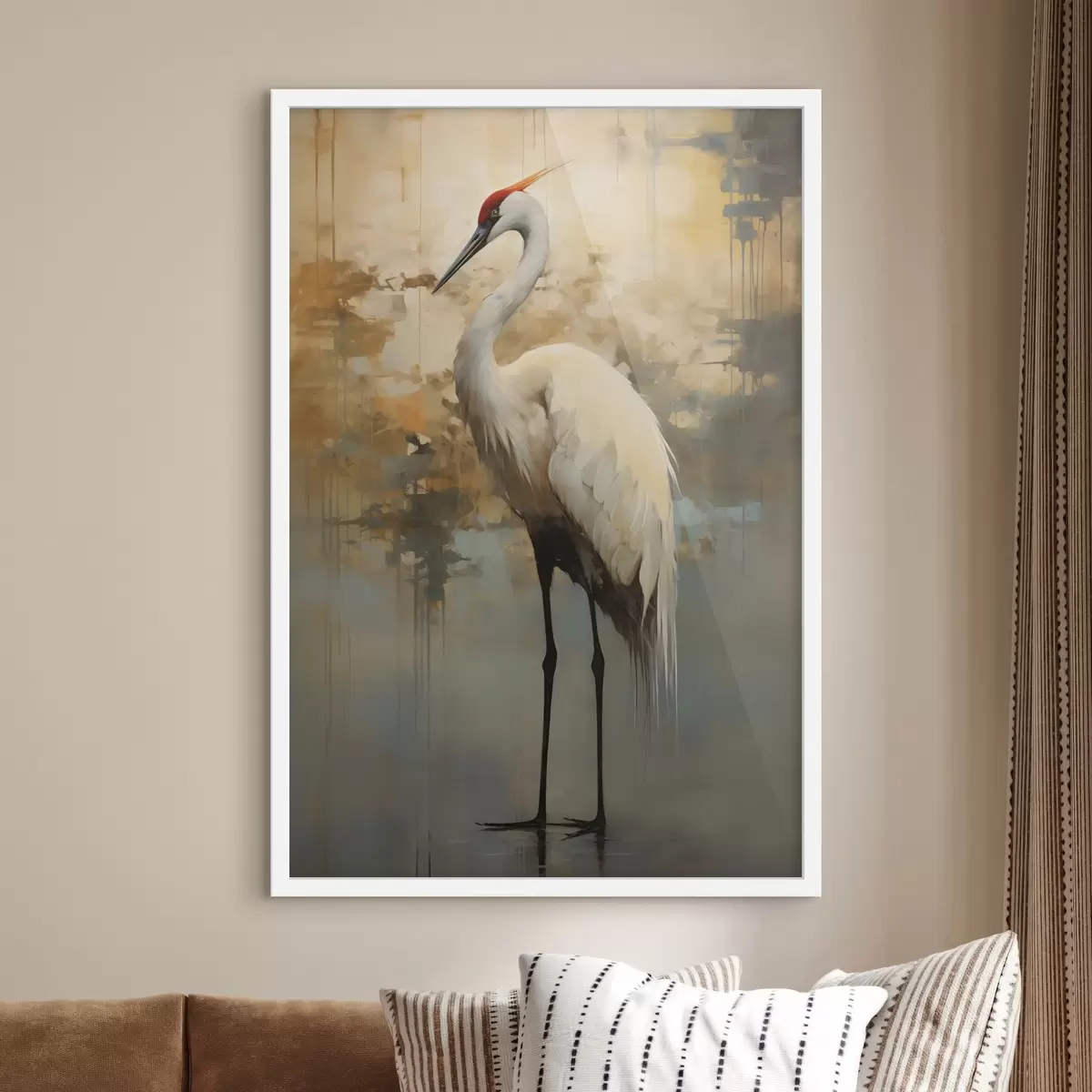 Poster Airone bianco su uno sfondo di sfumature gialle, marroni e blu che suggeriscono un paesaggio nebbioso e astratto Nr f45192