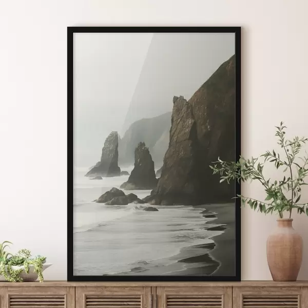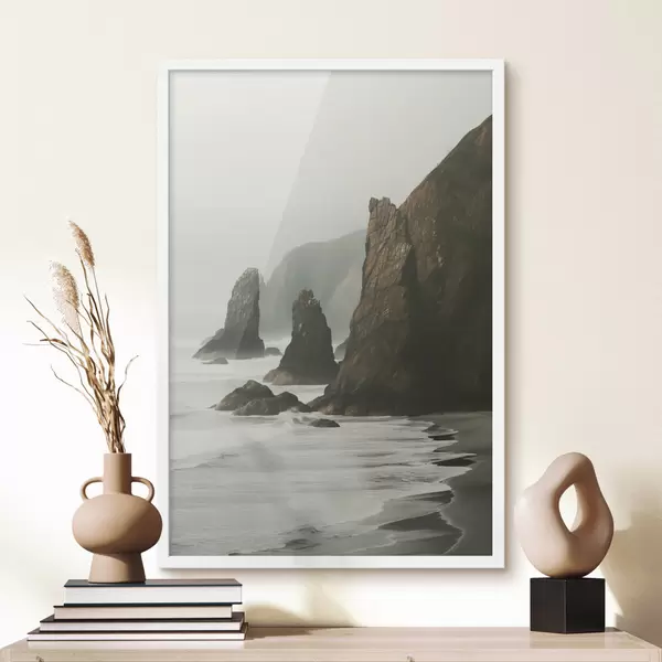 Poster Scogliere rocciose e costa marina, onde che si infrangono sulla riva, paesaggio dall'atmosfera lunatica, toni terrosi Nr f45193
