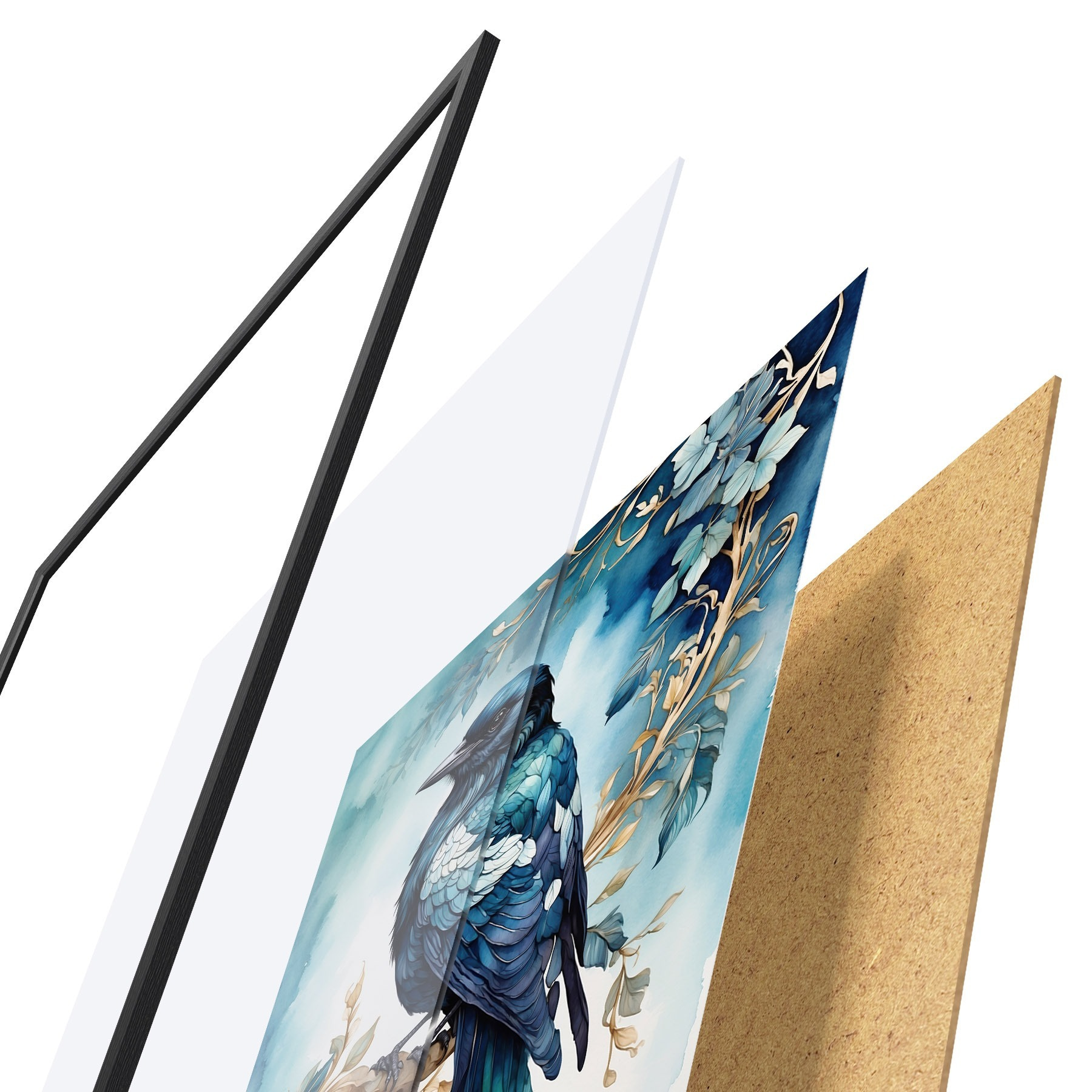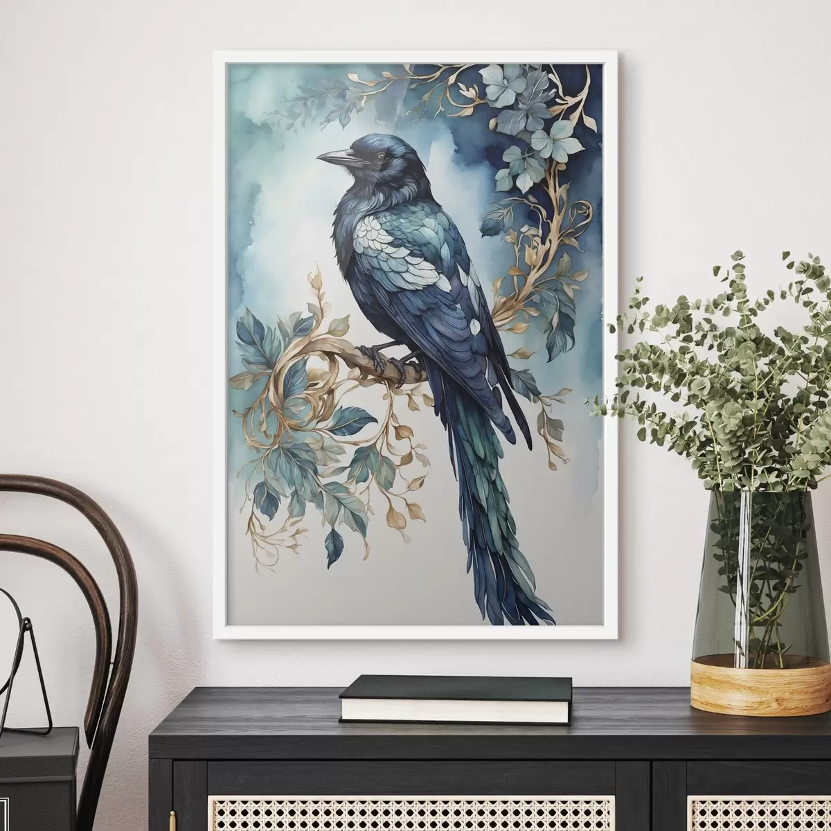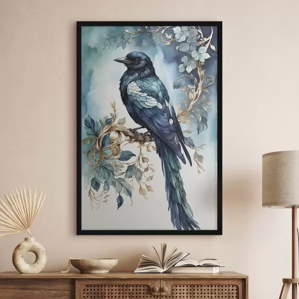 Poster Uccello blu su un ramo con foglie in stile acquerello Nr f45483