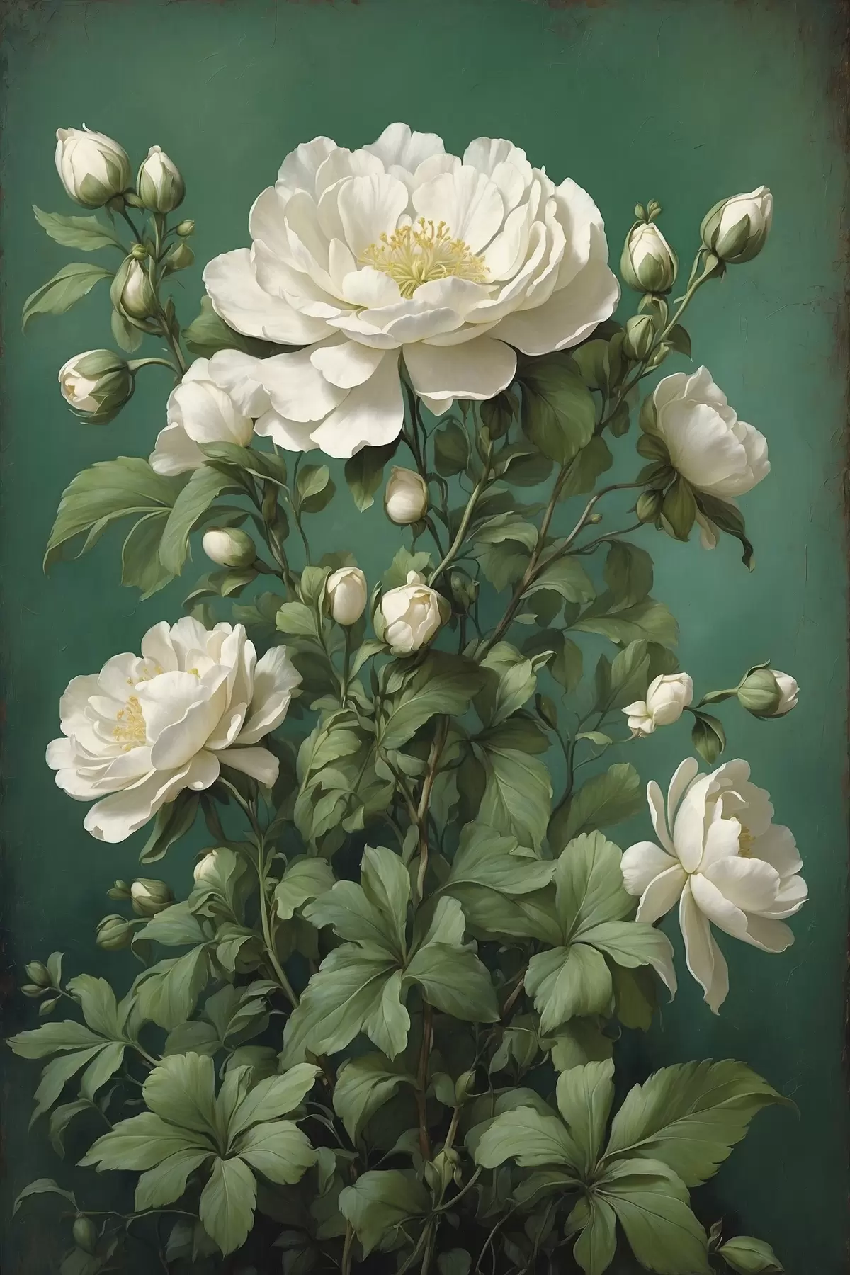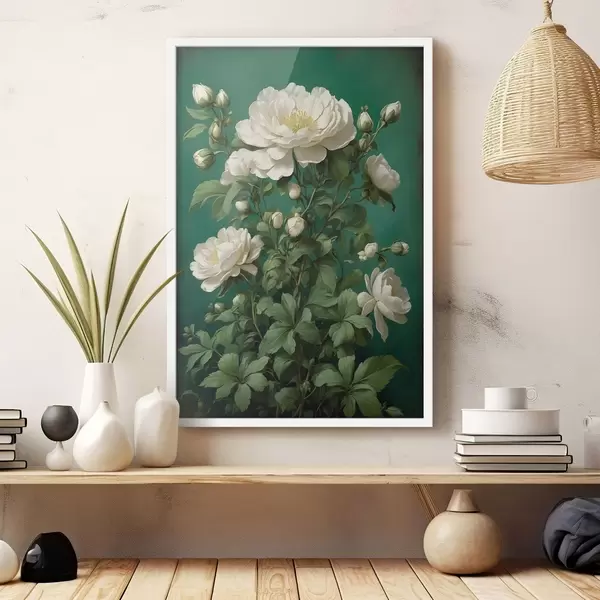 Poster Fiori di peonia color crema su sfondo verde Nr f45491