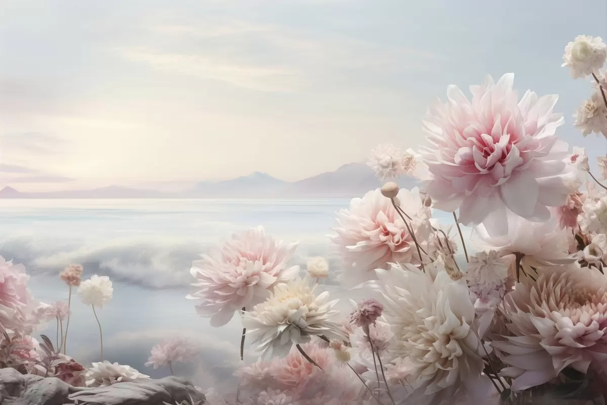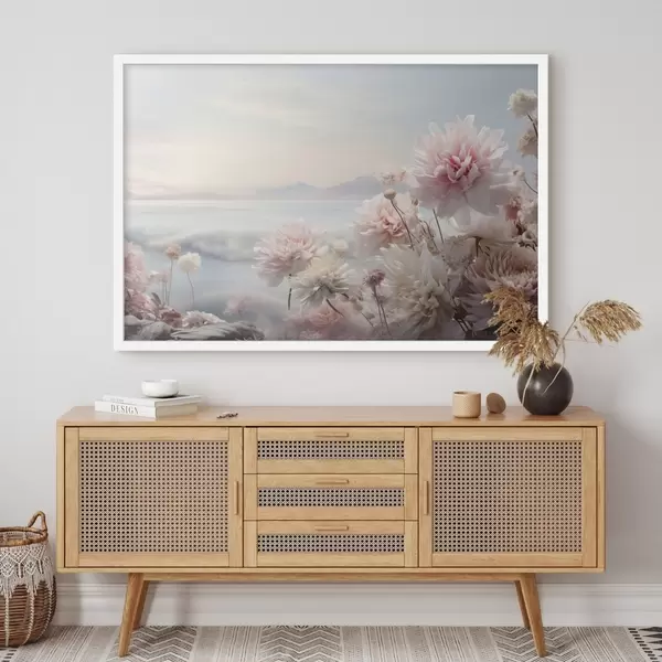 Poster Delicati fiori rosa in riva al mare all'alba Nr f45496