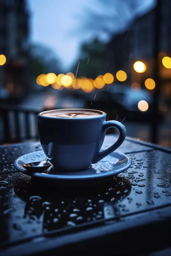Poster Una tazza di caffè sul tavolo sotto la pioggia Nr f45497