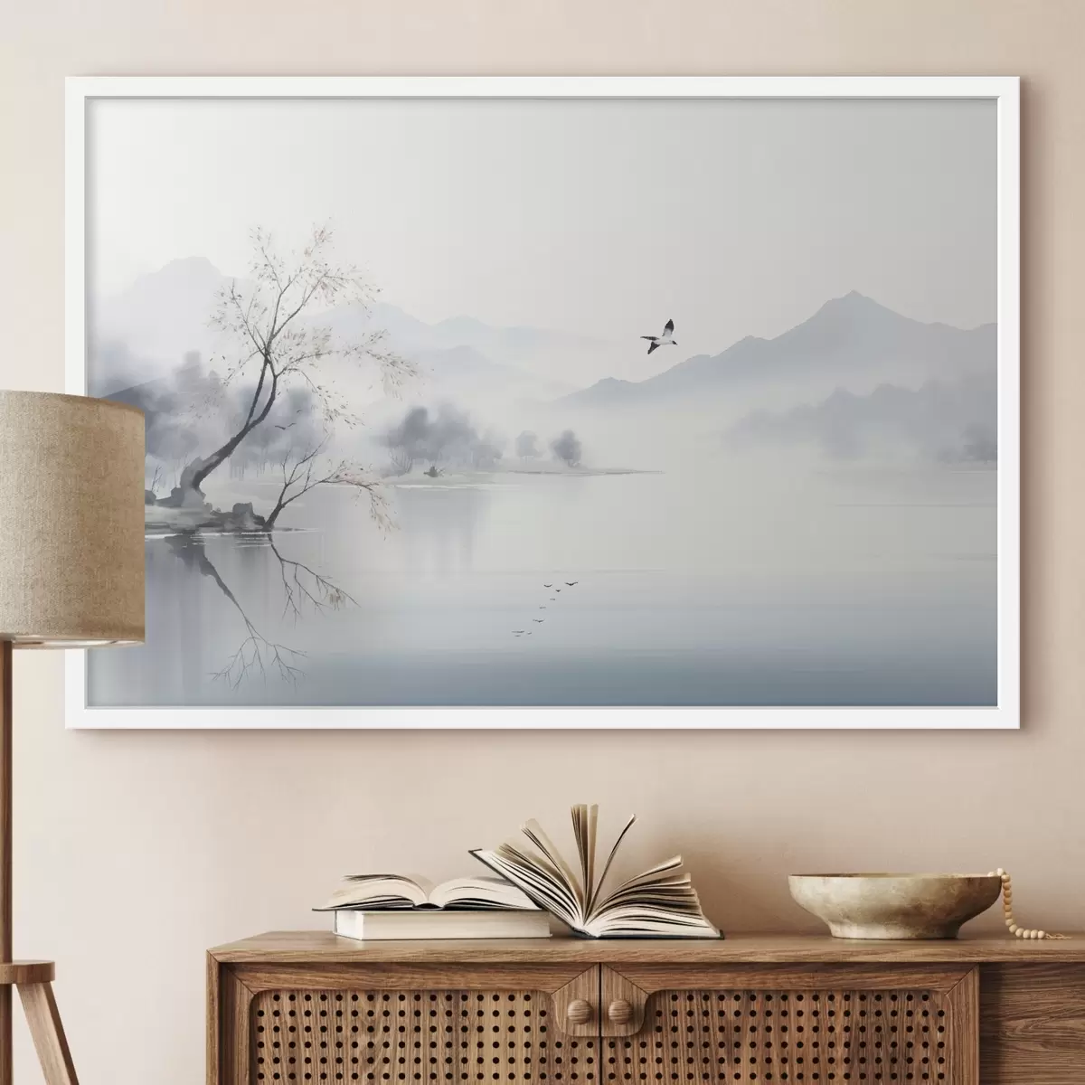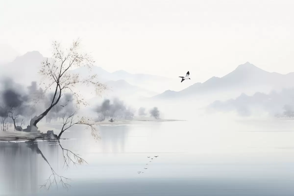 Poster Paesaggio nebbioso con albero, montagne e uccelli Nr f45518