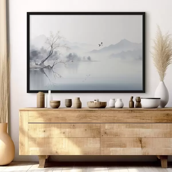 Poster Paesaggio nebbioso con albero, montagne e uccelli f45518