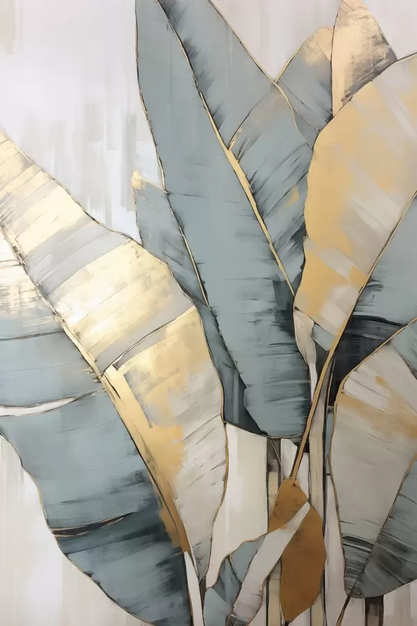 Poster Foglie di banano blu, grigie e gialle con pennellate visibili, su uno sfondo bianco astratto Nr f45552