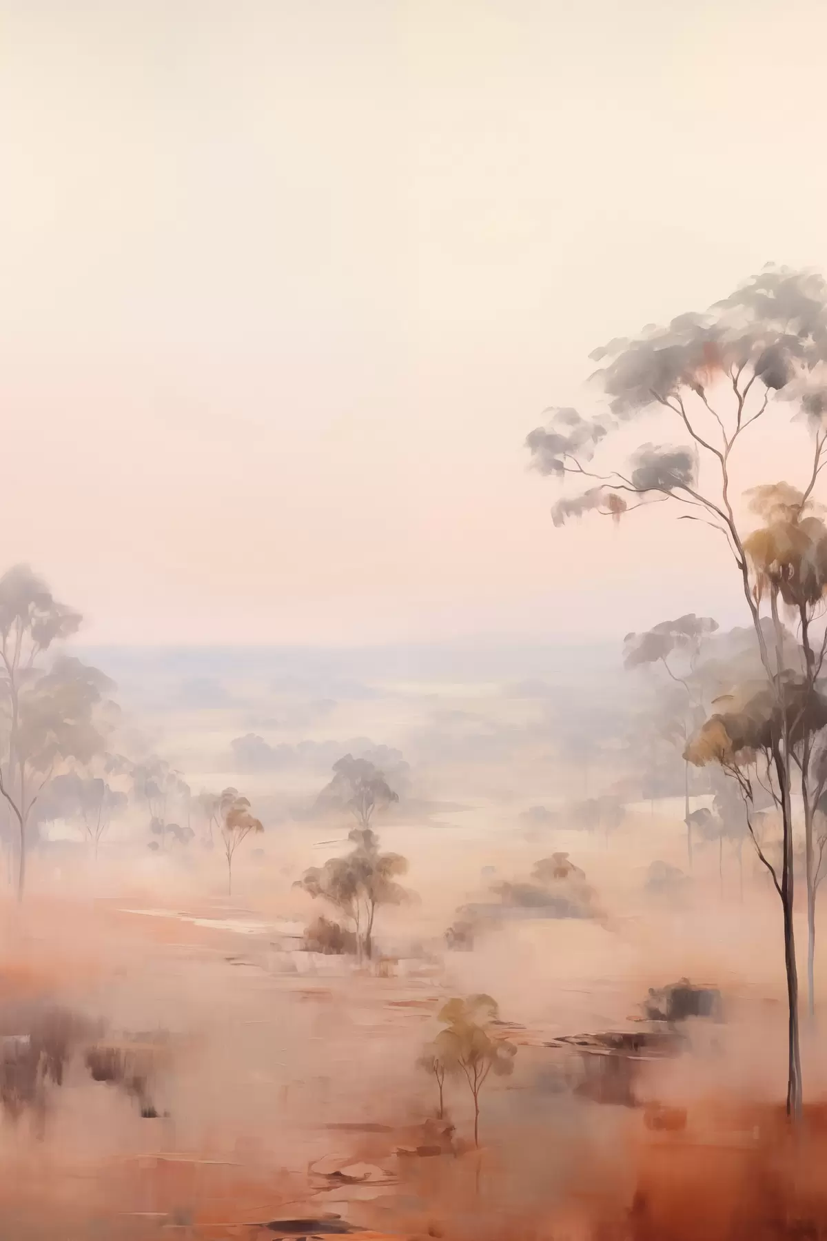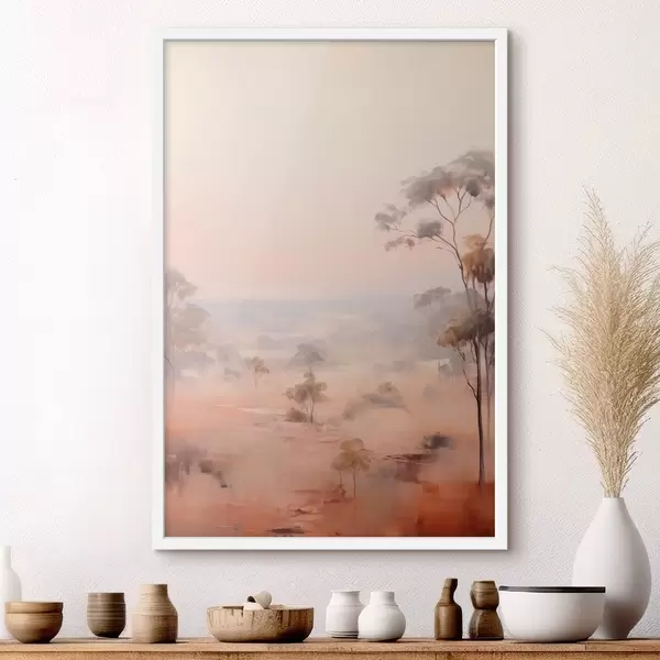 Poster Un paesaggio con cespugli e alberi nei toni pastello del rosa, dell'arancione e del marrone, con le montagne sullo sfondo Nr f45554