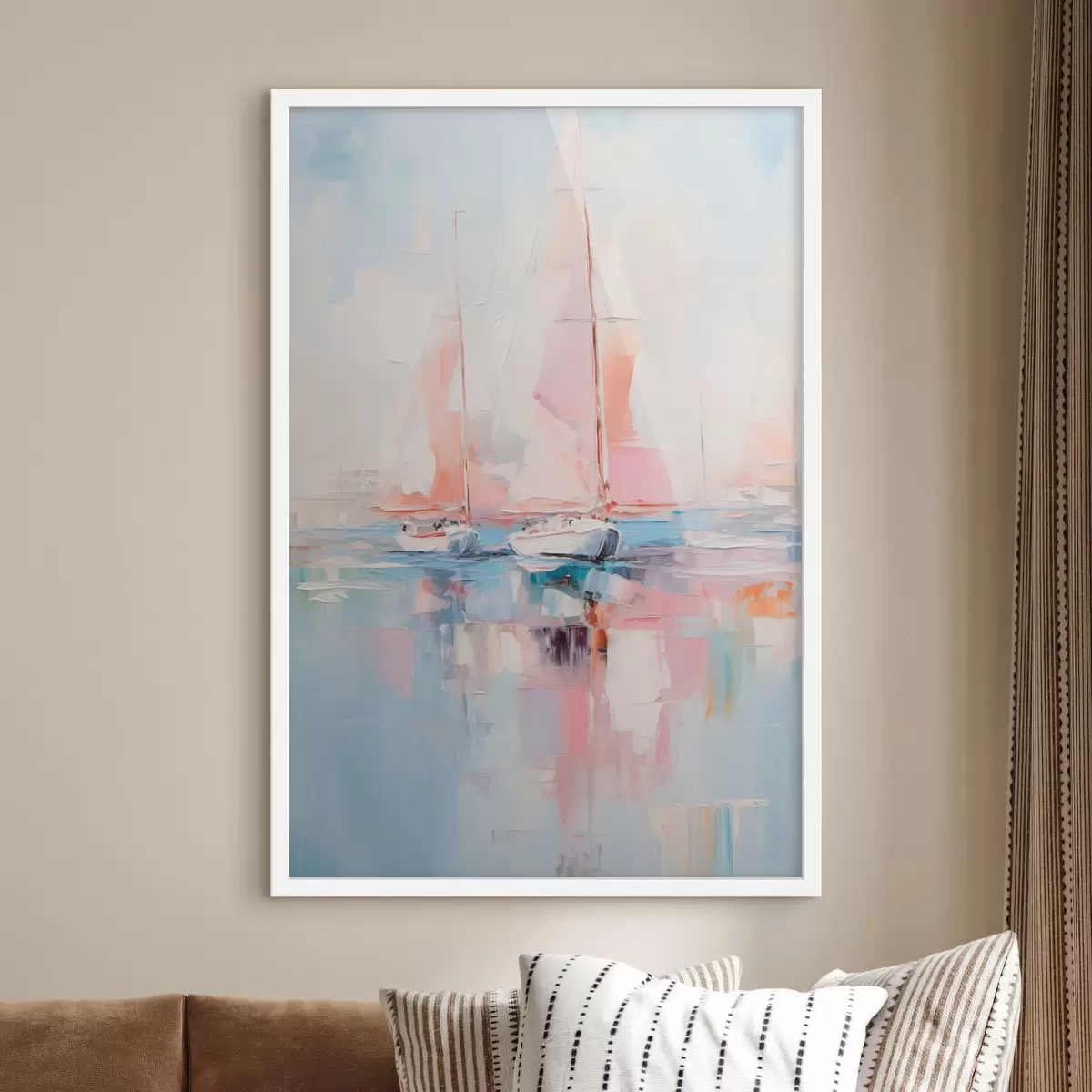 Poster Barche a vela con vele rosa che galleggiano su un mare calmo, riflessi delle barche nell'acqua, colori pastello tenui Nr f45557