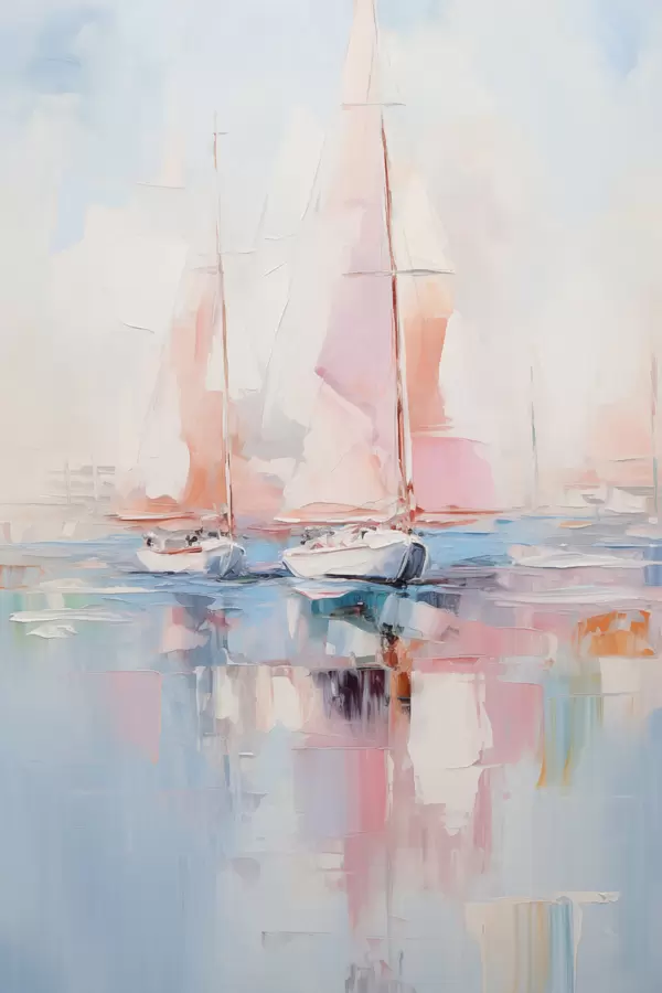 Poster Barche a vela con vele rosa che galleggiano su un mare calmo, riflessi delle barche nell'acqua, colori pastello tenui Nr f45557