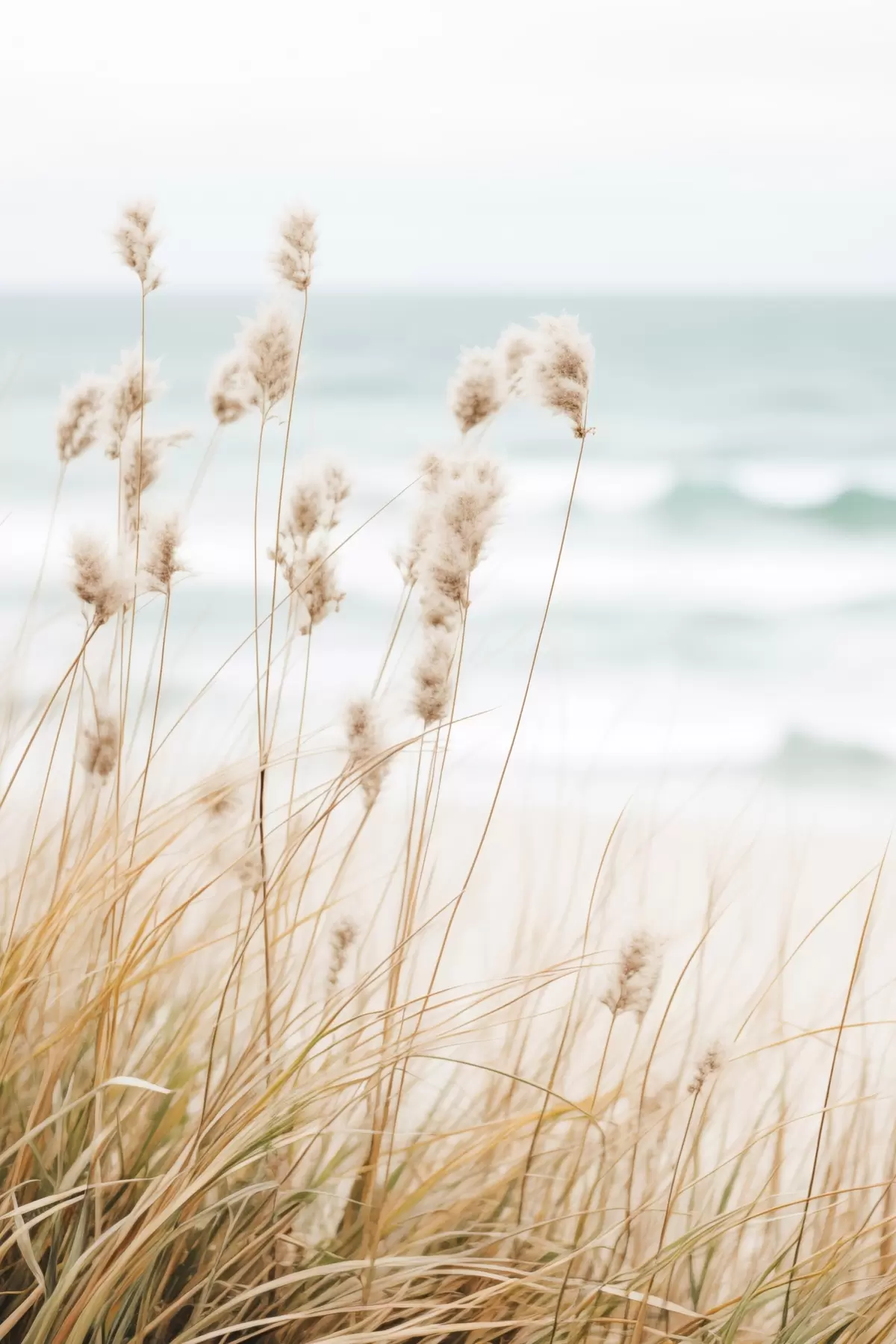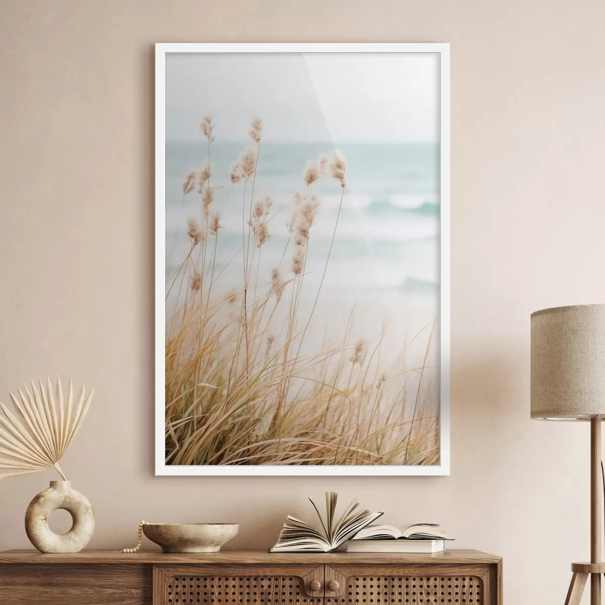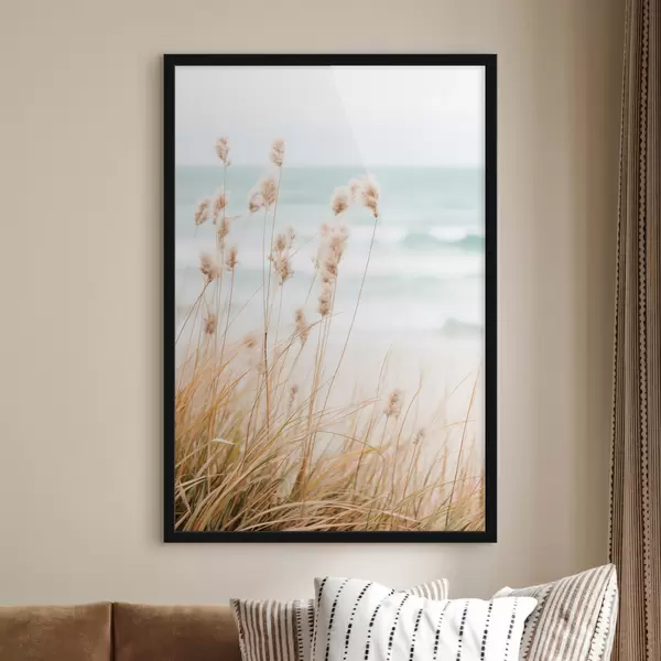 Poster Erba alta con teste di semi soffici, spiaggia sabbiosa e onde dell'oceano sullo sfondo, tavolozza di colori tenui e smorzati Nr f45561