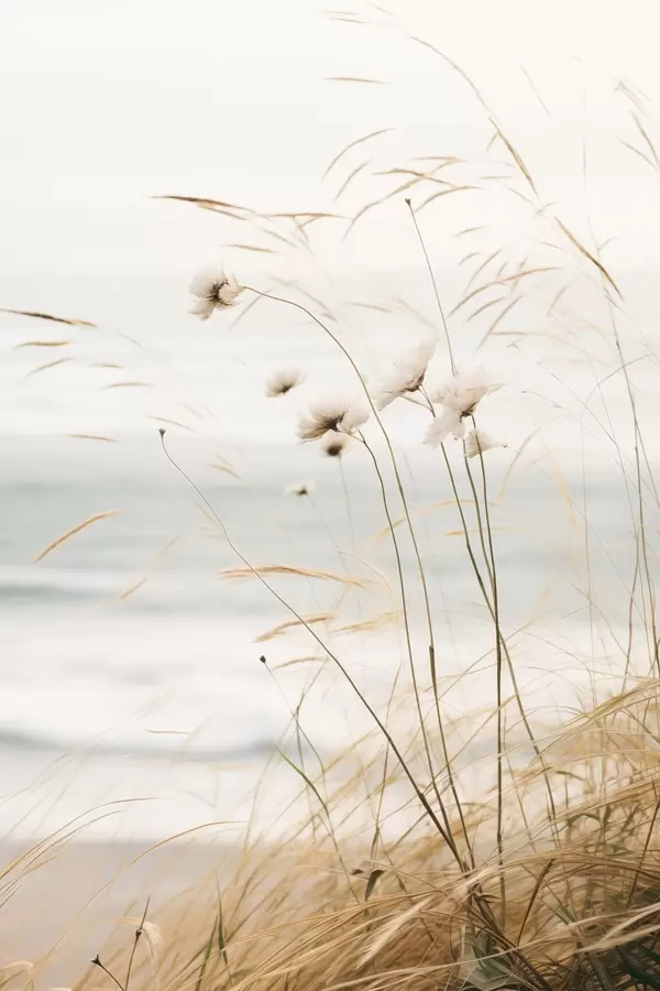 Poster Alcune erbe di cotone e altre erbe secche davanti a un mare sfocato, con una tavolozza di colori tenui e sfumati f45562