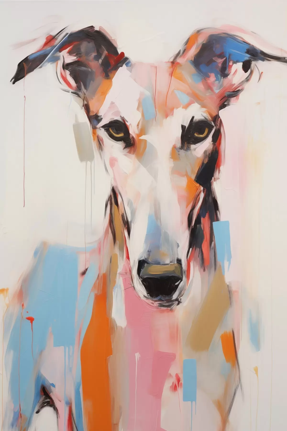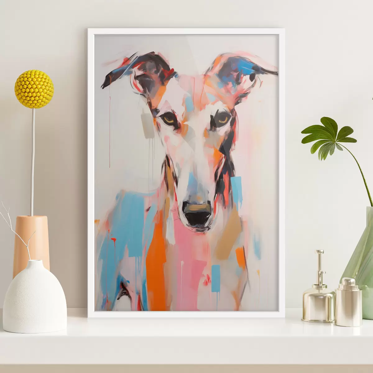 Poster Un cane levriero, dipinto con colori vivaci come l'arancione, il rosa e il blu, su uno sfondo bianco f45565