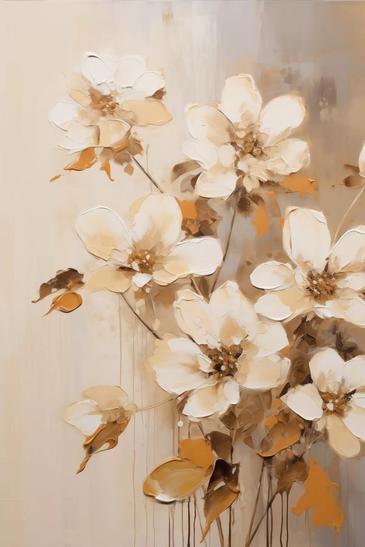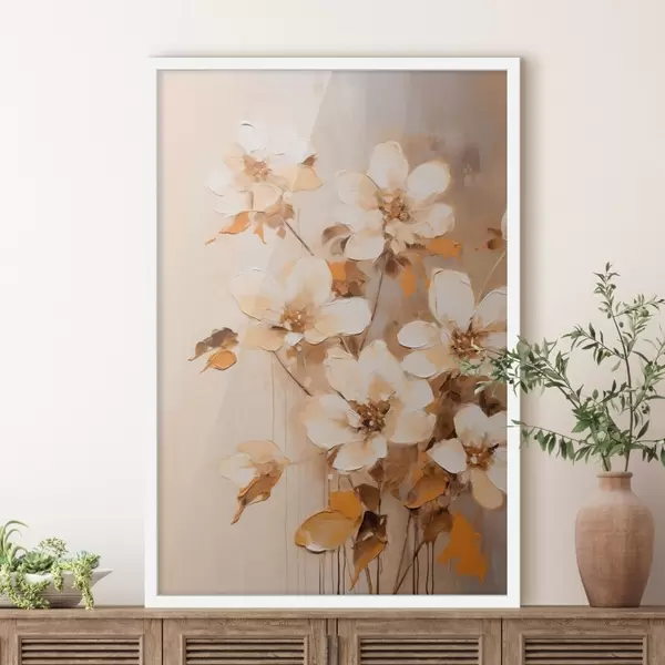 Poster Fiori bianchi con foglie arancioni, pennellate delicate, composizione floreale, arte botanica Nr f45574