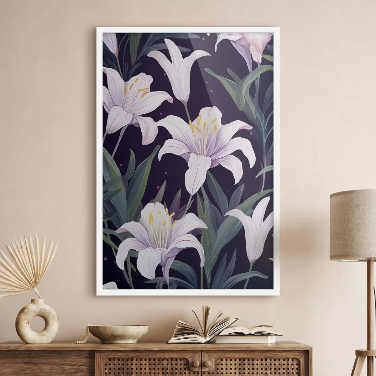 Poster Delicati gigli su sfondo scuro con foglie verdi Nr f45697