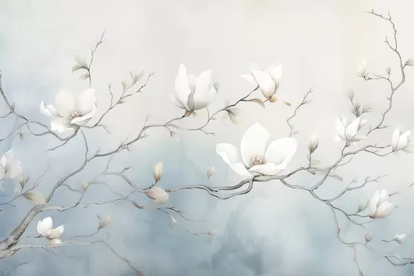 Poster Rami di magnolia con fiori bianchi su uno sfondo delicato Nr f45806