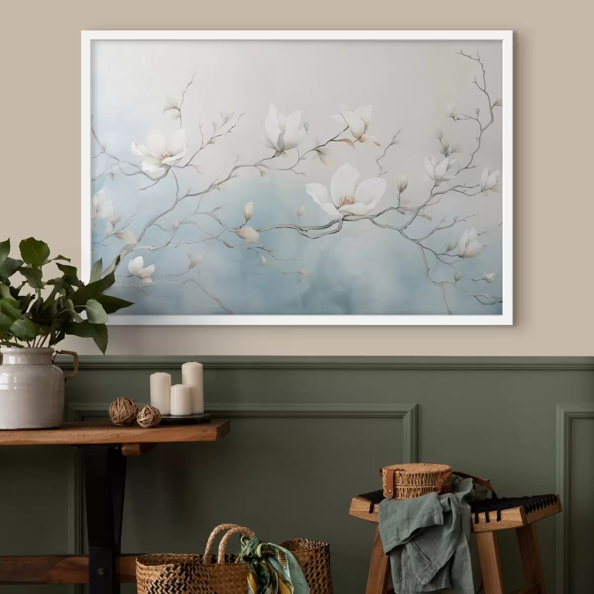 Poster Rami di magnolia con fiori bianchi su uno sfondo delicato f45806