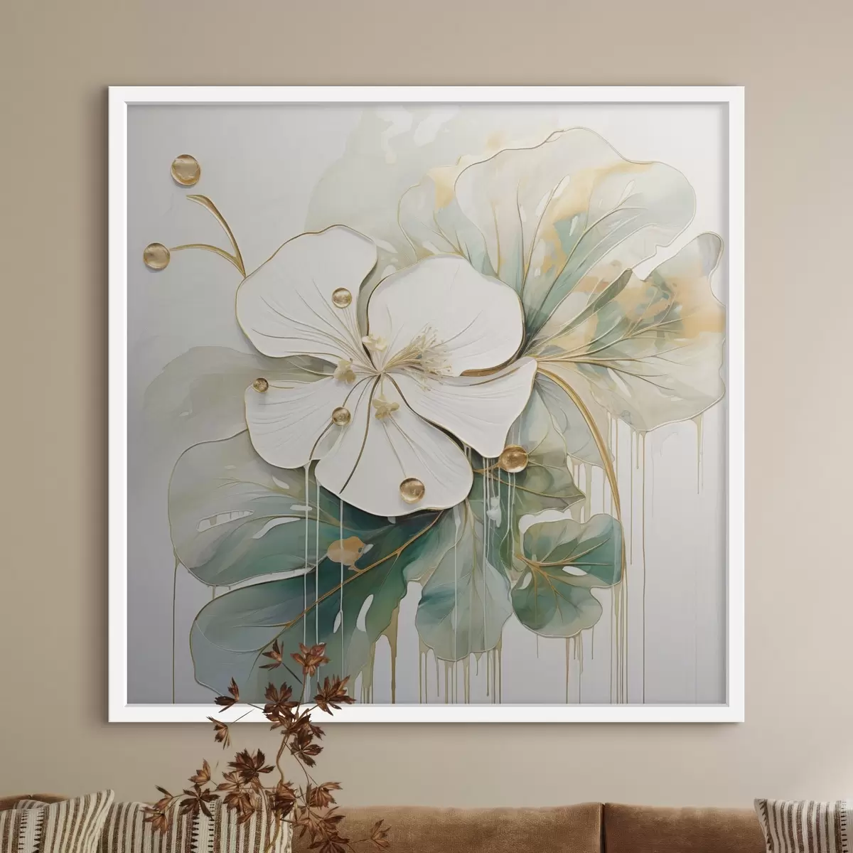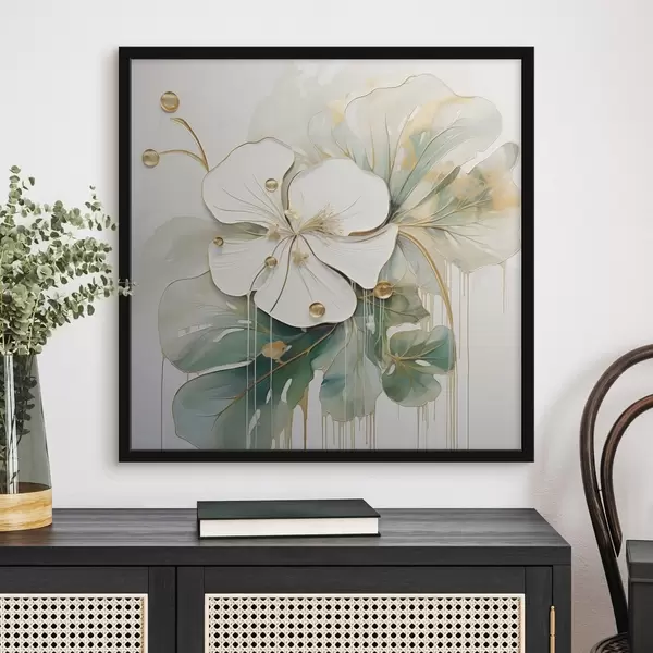 Poster Un fiore bianco con dettagli giallo-arancio e foglie verdi Nr f45815
