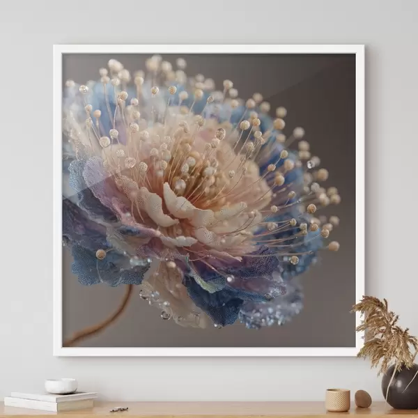 Poster Fiore perlato con gocce di rugiada, petali color pesca e blu Nr f45911