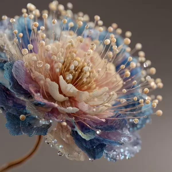 Poster Fiore perlato con gocce di rugiada, petali color pesca e blu Nr f45911