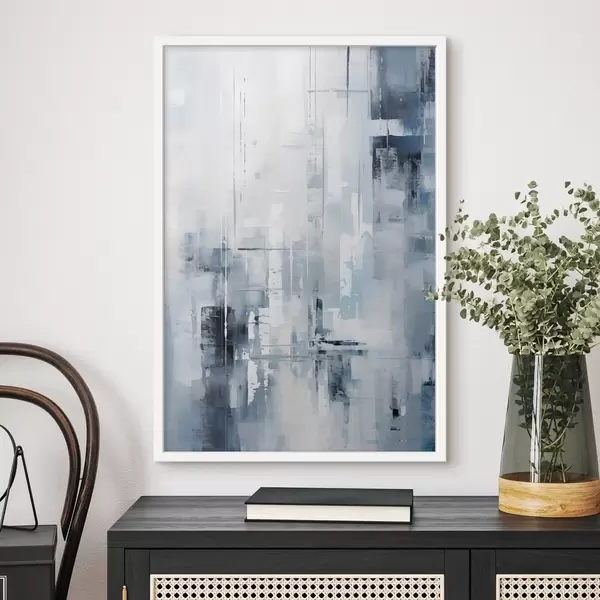 Poster Imitazione di pittura astratta con colori blu, grigio e bianco, linee verticali e forme geometriche f45927