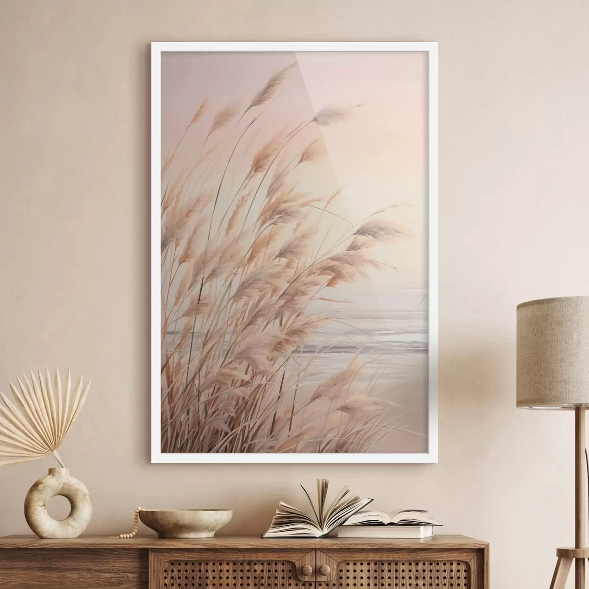 Poster Erba della Pampa con una tavolozza di colori arancione pastello, cielo rosa chiaro, un paesaggio tranquillo Nr f45934